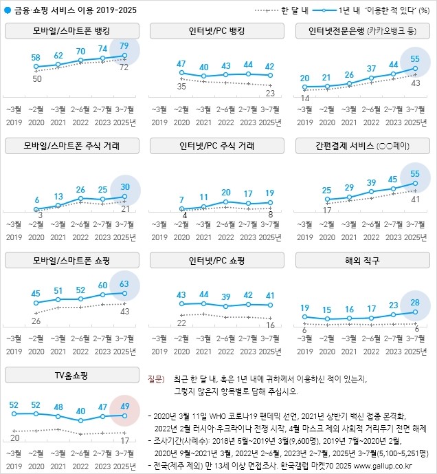 한국갤럽이 2025년 9월 30일 공개한 ‘마켓70 2025’ 조사에 따르면 전국 만 13세 이상 소비자의 모바일 뱅킹 이용률은 79%에 달했으며, 간편결제와 인터넷전문은행도 절반 이상이 이용하는 등 금융·쇼핑·생활편의·미용 전반에서 모바일 중심 서비스가 일상으로 자리 잡은 것으로 나타났다.