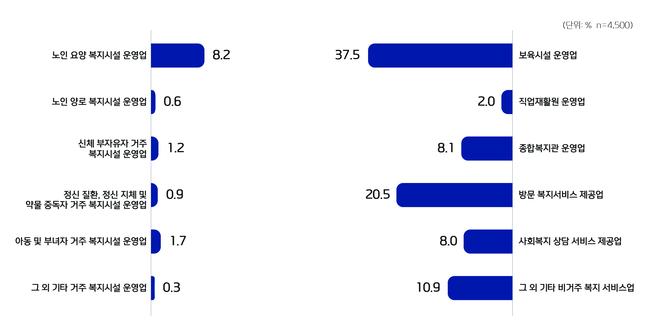 조사는 한국표준산업분류상 사회복지서비스업에 해당하는 4,500개 사업체를 대상으로 지난해 10~11월 두 달간 진행됐다. 방문·유치조사와 웹 조사를 병행해 운영 현황 전반을 점검했다.