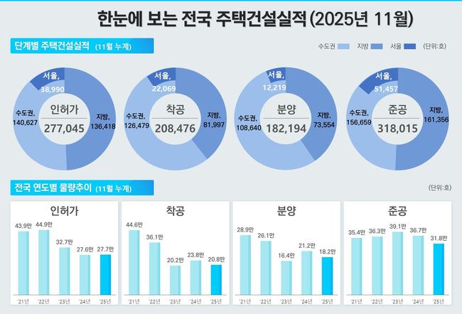 국토교통부는 2025년 11월 주택 인허가가 수도권을 중심으로 증가했지만 착공·분양·준공은 전반적으로 감소했고, 미분양 주택은 소폭 줄었으나 준공 후 미분양은 늘어났다고 밝혔다.
